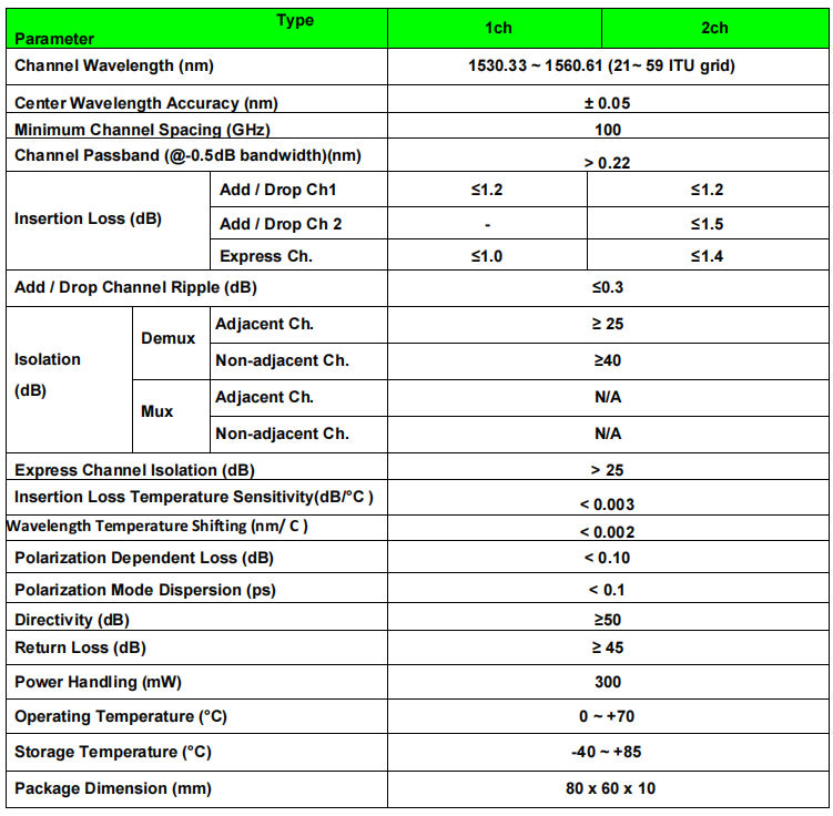 100GHz/200GHz wavelength multiplexer(100,200G DWDM OADM Module) utilizes thin film coating technology and proprietary design of non-flux metal bonding micro optics packaging to achieve optical add or drop at a ITU wavelength. It provides ITU channel center wavelength, low insertion loss, high channel isolation, wide pass band, low temperature sensitivity and epoxy free optical path .It can be used for wavelength add/drop in telecommunication network system.