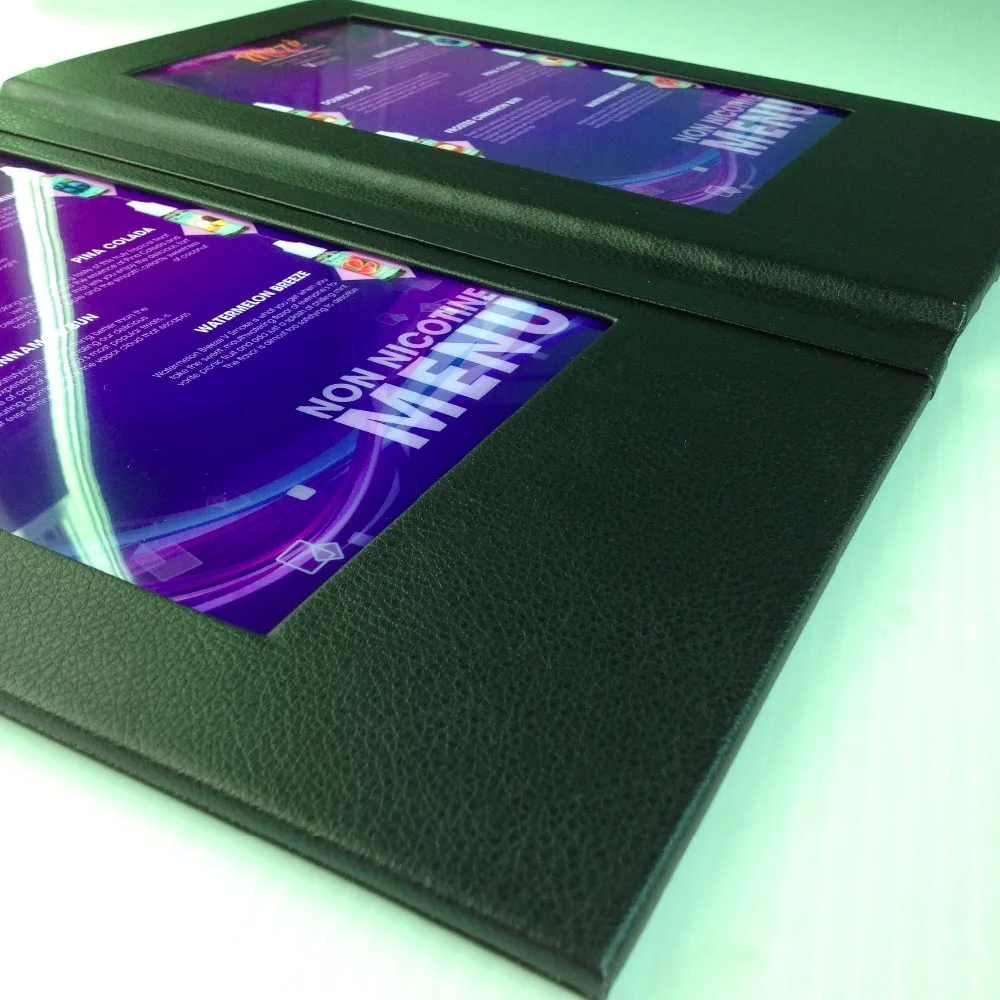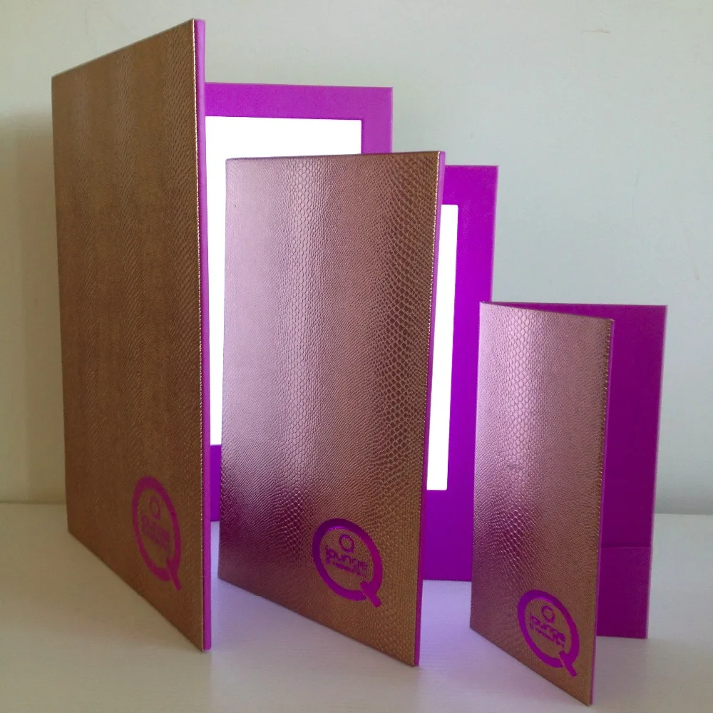 Best LED illuminated menu is made by LED strips and light panel, with imitation leather wrapped. they are designed for users to read menu easily in dim area. Menu covers insertable from top (or side) for sliding the printed menu sheets in and out. With re-chargeable energy source.