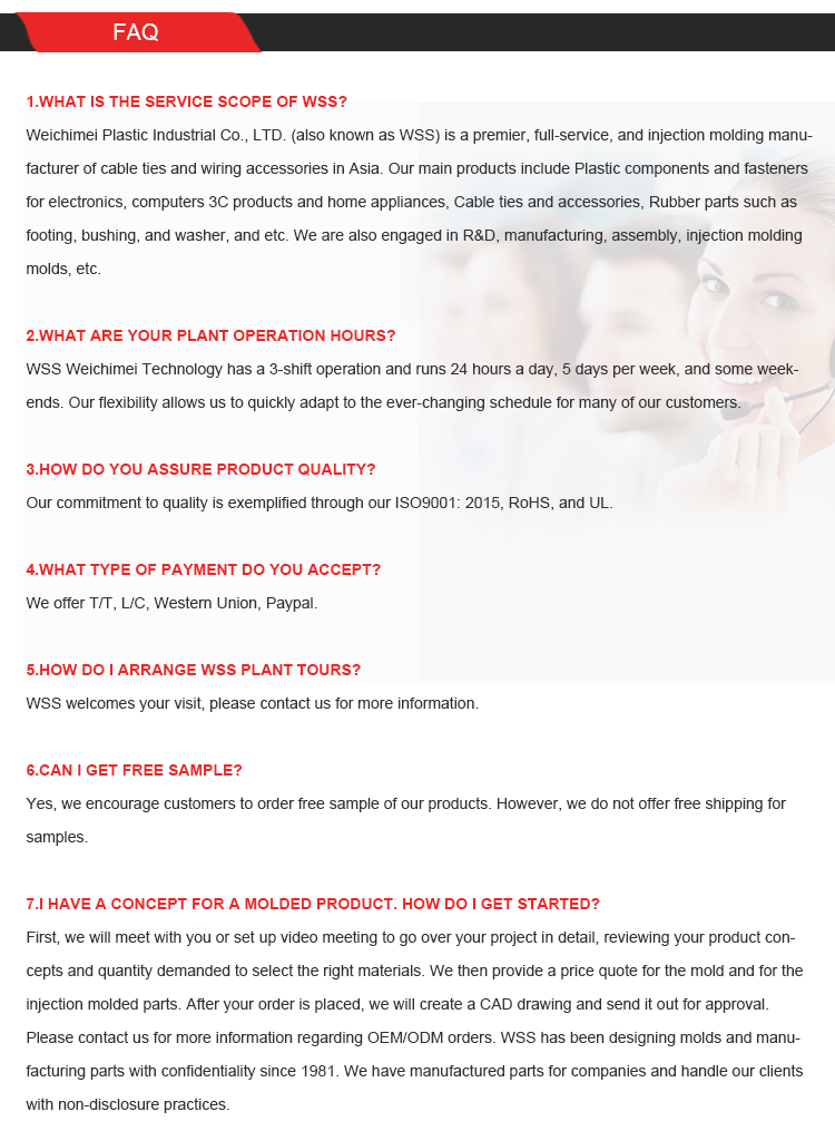 WEICHIMEI TECHNOLOGY INDUSTRIAL CO.,LTD. is a professional technology manufacturer of wiring accessories, dedicated to wiring equipment mold design, product development, mass production and sales. We are specialized in the production of LED spacer support, PC board accessories, adhesive tie mounts, nylon cable ties, electronic plastic fasteners, connectors, terminals and other products, and undertake OEM and ODM plastic product production. Our products are widely used in home appliances, electronic equipment, and etc.