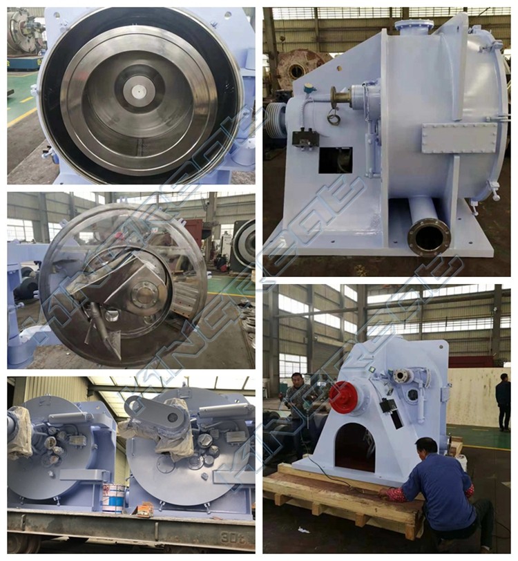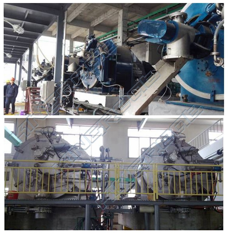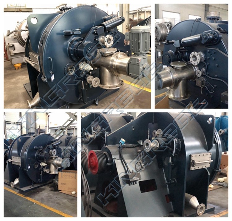 PGKS horizontal siphon scraper centrifuge is a kind of siphon scraper discharging centirfuge designed on the basis of PGK horizontal scraper discharging centrifuge. PGKS centrifuge is an automatic centrifuge with intermittent feeding and filtered scraper discharging. Except centrifugal force, siphon centrifuge also has a kind of siphon draught force similar to vacuum pipe. Compared with common scraper discharging centrifuge, PGKS centrifuge owns higher production capacity and separating washing effect. The machine is controlled by PLC and regulates speed by frequency convertorm and braking system applies both dynamic braking and regenerative braking. According to the predetermined procedures, such as feeding, separating, washing, discharging and mesh washing are all under according speed(or full speed).