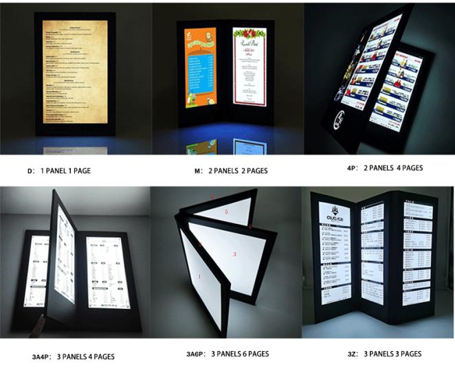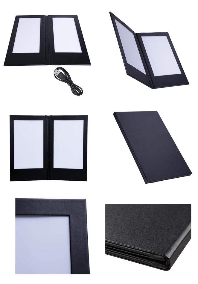 Our LED Illuminated Menus actually Glow, light up and illuminate well enough to see the menu items in a completely dark area, restaurant or venue. They use transparent printed inserts that can be changed when needed. Typically lasting 8-10 hours before needing to be recharged, our LED Illuminated Menus feature an auto off switch when the menu is closed. We have the one page, 2 pages, 3 pages, 4 pages menu covers in different sizes which are sold everywhere. These are also known as light up menu, glow menu, light up table menu and illuminated menus.