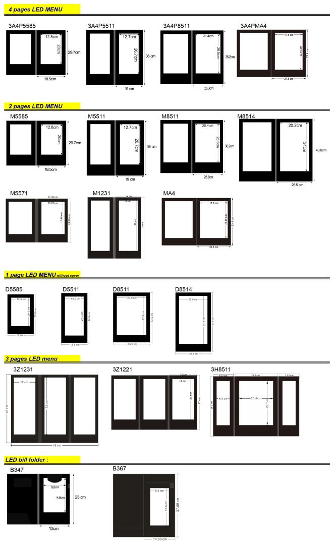 Size charts of the LED menu cover