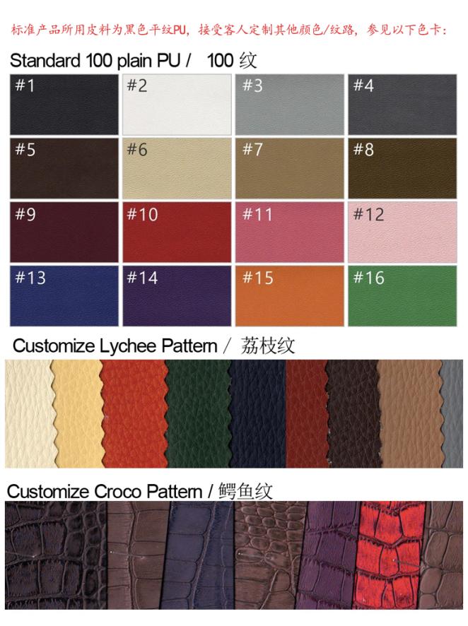 The standard product is in black plain PU leather without any imprint. We also accept customizations.