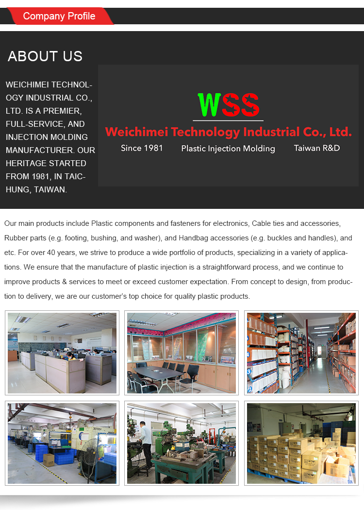 WEICHIMEI TECHNOLOGY INDUSTRIAL CO.,LTD. is a professional technology manufacturer of wiring accessories, dedicated to wiring equipment mold design, product development, mass production and sales. We are specialized in the production of LED spacer support, PC board accessories, adhesive tie mounts, nylon cable ties, electronic plastic fasteners, connectors, terminals and other products, and undertake OEM and ODM plastic product production. Our products are widely used in home appliances, electronic equipment, and etc.