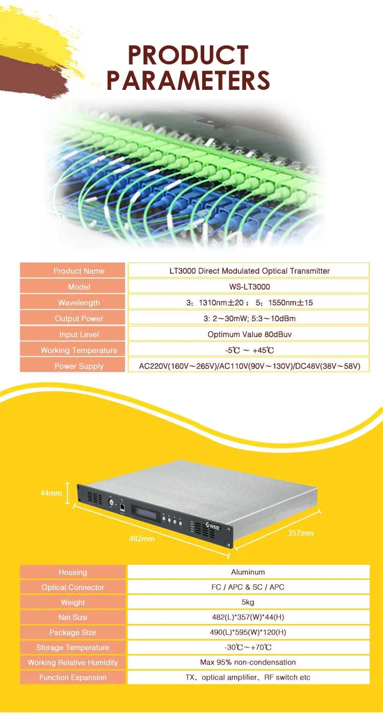 WS-16LTxxxx CATV optical transmitter made improved better in Power consumption, output accuracy and high reliability than that of WS-15LTxxx style which is mainly used in optical fiber Transmission of Television Image Signal, Digital Signal, Television ,Telephone, Voice Signal Data (or Compressed Data) Signal.