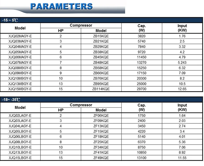 · Temp.: -15 to 5 °C -18 to -35 °C · Capacity: 1750 to 29700W · Voltage: 380V/3P/50HZ · Refrigerant: R404A