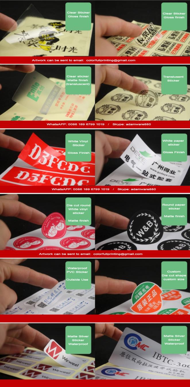 We do many kinds of adhesive label stickers by custom. For example, paper, kraft, pvc, vinyl, epoxy, hologram, etc., with high quality printing service and after works, like lamination, AQ, foil stamp, UV, embossing, etc. We have more than 15 years experienced sales team to meet your special needs.