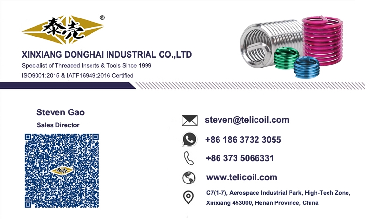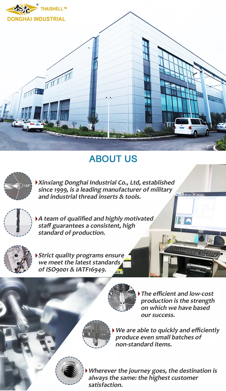 Xinxiang Donghai Industry Co., Ltd. is located in the Hi-Tech Zone , which is the center of highly skilled talents of Xinxiang City. We specialized in manufacturing the different series of Wire Thread Inserts according to National Standard, MS Standard,ZIN Standard, Unified Thread Standard and it also maktes all kinds of related tools. We registered the self-owned brand Thaishell in 2014.Our research and development team consists of young and middle-aged experts having rich experience in fastener industry. We strict controls product quality and management system, to provide individualized product solutions.