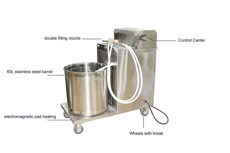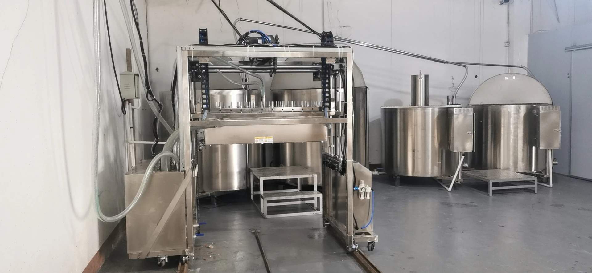 It is a fully automated machine which the main element is a mesh conveyor. The conveyor transports several containers in a row at the same time, directly under the set of dosing nozzles, fixed in the dosing station, connected with the paraffin melter. As a standard, the line is equipped with two dosing stations that operate the main chamber and the so-called refills. The filled containers are cooled with efficient fans, optionally air-conditioning system may be used. The length and width of the sequence (number of nozzles in a row) is adjusted individually to the needs and size of the Customer's production plant.
