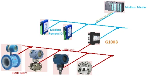 G1003 gateway realizes protocol converting from HART to Modbus RTU / ASCII. Supporting to connect multi HART slave devices into Modbus network. In the gateway, HART terminal is master station, Modbus terminal is slave station.