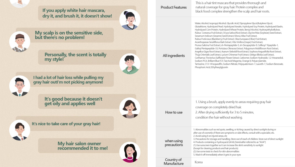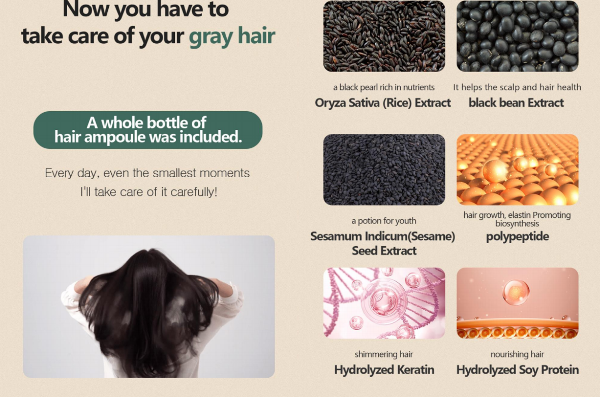 Introducing our nutrient-rich Hair Mascara, specially crafted to provide instant gray hair coverage without the use of traditional hair dye ingredients. Formulated with a blend of 8 powerhouse ingredients, this gentle, effective solution combines natural black rice extract, black bean extract, and black sesame extract for deep, natural-looking coverage that seamlessly blends with your hair.