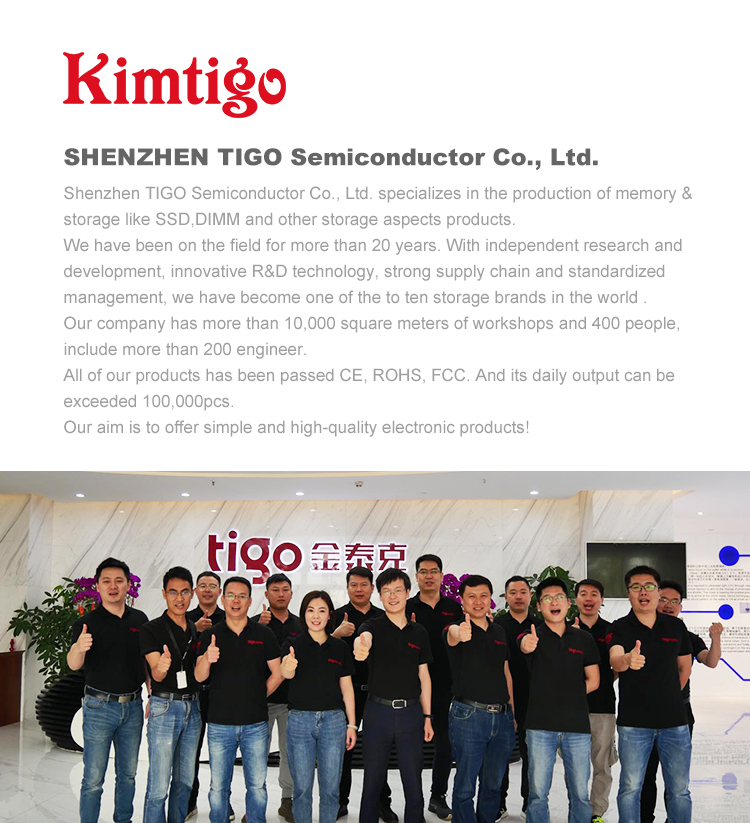 Headquartered in Pingshan District, Shenzhen City, China, Kimtigo has more than 500 employees. So far, Kimtigo has acquired more than 200 independent intellectual property rights, including more than 140 actual and authorized invention patents, and covering product development, manufacturing and quality control. Kimtigo has gradually developed unique comprehensive competitive advantages that cover semiconductor data storage product design, customized firmware development, wafer and package testing, module manufacturing, product compatibility and adaptability testing, and independent brand sales system.