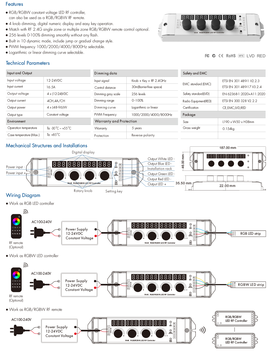 LED RGBW Dim Controller with 2.4G RF