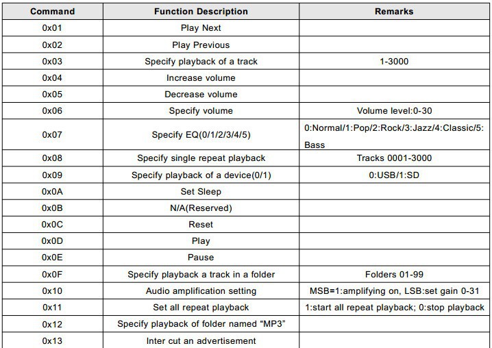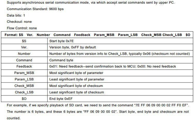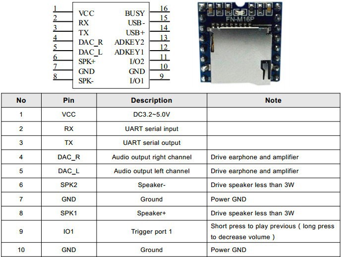 FN-M16P is a small and low price MP3 module with an simplified output directly to the speaker. The module can be used as a stand alone module with attached battery, speaker and push buttons or used in combination with an Arduino UNO or any other with RX/TX capabilities.