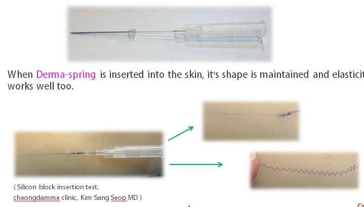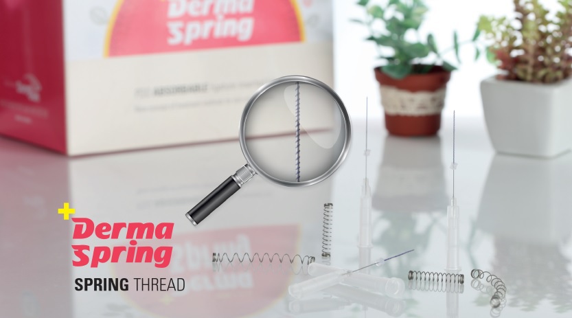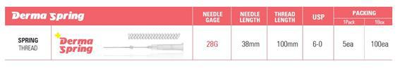 Why RE: Derma Spring? : 1. Coiled spring shaped PDO thread, It replaces the previous tornado shaped PDO and is superior in its action 2. Maintaining its elasticity and shape after insertion into the skin 3. Derma spring itself augments the process effectively tightening the skin and enhancing volume and lifting 4. Increase production of collagen fibers and cytokines, generating healthy new skin and healing Super elastic force RE: Derma spring Effectiveness 1.Spring-shaped PDO with high elasticity by special methods 2. Response made between constant physical stimulus and tissue through elasticity 3.Maximize fibrous bridging effect created between threads by winding up threads around a needle very densely with cylindrical pore for excellent volume effect 4.Argumentation effect by inserting densely wound threads (rolled length 2.0cm, unrolled length 10cm) 5.Constant mechanotransduction effect through elasticity 6.Increase the secretion of cytokines 7.Sterilized production for elasticity 8.Patented technology maintaining elasticity for 2 years at the longest Product Description – Spring thread : Derma-Spring 1. Needle gauge : 28G, Usp size 6.00 2. Needle length(Thread length) : 40mm(100mm) 3. Certification : ISO, KFDA, CE, KGMP 4. Spring-shaped biodegradable PDO thread with high elasticity 5. Properties: Medical Adhesive & Suture Material 6. Type: Medical Absorbable Suture with Needle 7. Brand Name: N.Finders korea RE Thread 8. Model Number: Derma-spring 9. Place of Origin: Seoul South Korea 10. Delivery Detail: In 2weeks Major features of Derma spring 01. Elastic force effect by spring shape PDO 02. Continuous physical stimulation to skin 03. Increase composition of collagen 04. Increase secretion of Growth factors and cytokines 05. High density linear effect by fibrous bridging effect 06. Augmentation effect by insertion of densely coiled tread (coiled length 2cm, spread length 10cm) 07. Continu ous mechanotransduction effect 08. High cell cultivation with large contact area Insertion guide for Derma spring -Please contact N-Finders for more information. RE: Thread Effectiveness 1. Neocollagenesis by PDO Foreign material 2. Neovascularization : Microcirculation Increase 3. Metabolism Increase : Growth Factor Increase 4. Tissue adhesion & Anchoring effect around PDO 5. Lipolysis Increase & Cellulite Decrease 6. Muscle Relaxation 8. Tissue anchoring effect 9. Decrease cellulite 10. Overall skin regeneration 11. Increase EGF 300 times 12. Increase FGF 350 times 13. Increase IGF 400 times 14. Increase TGF-ß 150 times 15. Increase VEGF 1000 times Resource :“Basic theory and Animal Experiment in vivo, in vitro” - By N.Finders Co., Ltd.