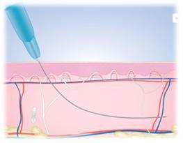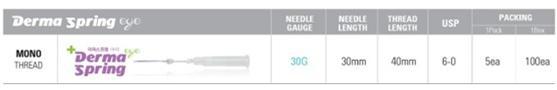 Why RE: Derma Spring eye? : 1. Specially designed for eye zone treatment 2. Blunt tip cannula type needle provides safe, easy and effective eye zone treatment 3. Almost no echymosis during treatment for eye zone 4. Remarkably reduce downtime, bruising, pain and complaints with great cosmetic outcomes Blunt Needle advantage : the micro cannula with blunt tip has flexibility and the ability to push aside blood vessels. It is possible with this cannula to do multiple passes in the dermis to stimulate new collagen. 1. Less pain : The pain was described as 3 (mild) for injections with the microcannula, increasing to 6 (moderate) for injections with the hypodermic needle 2. Less bruising, echymosis, and pain with faster recovery Major features of Derma spring EYE 1. Continuous skin stimulaiton from PDO thread 2. Increased production of collagen 2. Increased secretion of growth factor and cytokines 4. Continuous mechanotransduction effect 5. High cell cultivation with large contact area 6. Less bleeding, swelling and bruising 7. Removing dark circle, wrinkles and bags under eyes accrding to the inserting layers 8. Efficientely reduces the sagging around eyes 9. 100% PDO, a clinically proven bio-compantible material 10. Safe, Non-surgical soution Product Description – Spring thread : Derma-Spring EYE 1. Needle gauge : 30G 30mm, Usp size 6.00 2. Needle length(Thread length) : 40mm(100mm) 3. Certification : ISO, KFDA, CE, KGMP 4. Specially designed for eye zone treatment with Blunt tip cannula type needle 5. Properties: Medical Adhesive & Suture Material 6. Type: Medical Absorbable Suture with Needle 7. Brand Name: N.Finders korea RE Thread 8. Model Number: Derma-spring EYE 9. Place of Origin: Seoul South Korea 10. Delivery Detail: In 2weeks Insertion guide for Derma spring -Please contact N-Finders for more information. RE: Thread Effectiveness 1. Neocollagenesis by PDO Foreign material 2. Neovascularization : Microcirculation Increase 3. Metabolism Increase : Growth Factor Increase 4. Tissue adhesion & Anchoring effect around PDO 5. Lipolysis Increase & Cellulite Decrease 6. Muscle Relaxation 7. Tissue adhesion 8. Tissue anchoring effect 9. Decrease cellulite 10. Overall skin regeneration 11. Increase EGF 300 times 12. Increase FGF 350 times 13. Increase IGF 400 times 14. Increase TGF-ß 150 times 15. Increase VEGF 1000 times Resource :“Basic theory and Animal Experiment in vivo, in vitro” - By N.Finders Co., Ltd.