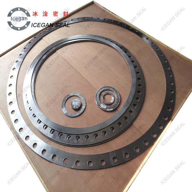 Reinforced Graphite Gasket is cut from pure graphite sheet or graphite sheet with metal reinforcement, features excellent corrosion-resistance, high-and-low temperature resistance, good compression resilient and high internsity it can be used as sealing elements of pipe, valve, pump, pressure vessel, heat exchanger and condenser, etc. Other complex gaskets such as water gauge gasket and flange gasket with bolt holes are available. Wrapped with metallic stripe in the inner and outer circle borderline. Keep the former excellent performances. Can be installed and disassembled conveniently without damage.It's widely used in flanges,valve bonnets,heat exchangers and level indicatiors etc..