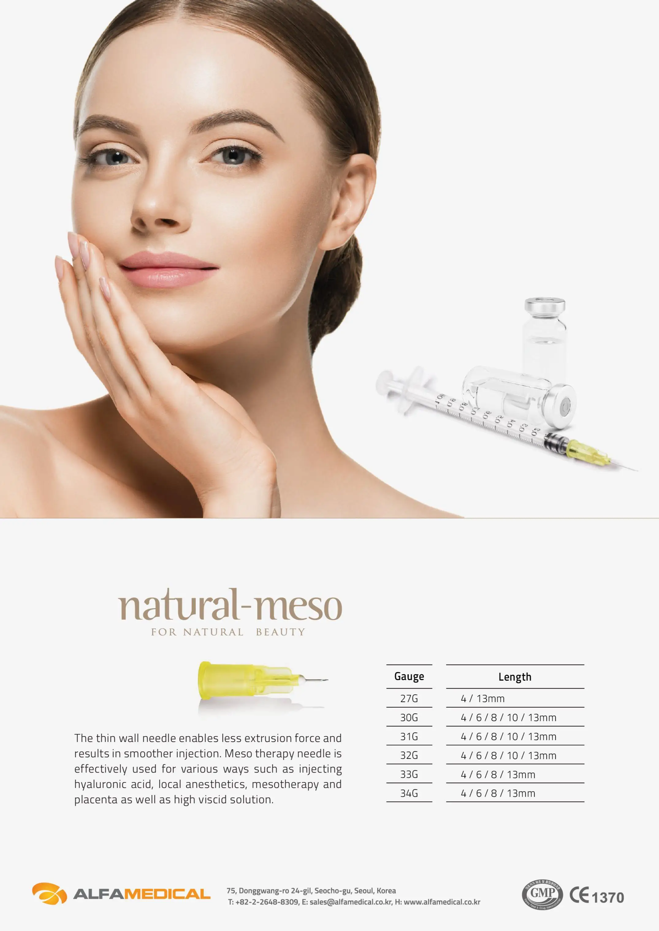 Meso therapy needle is effectively used for various ways such as injecting hyaluronic acid, local anesthetics, mesotherapy and placenta as well as high viscid solution