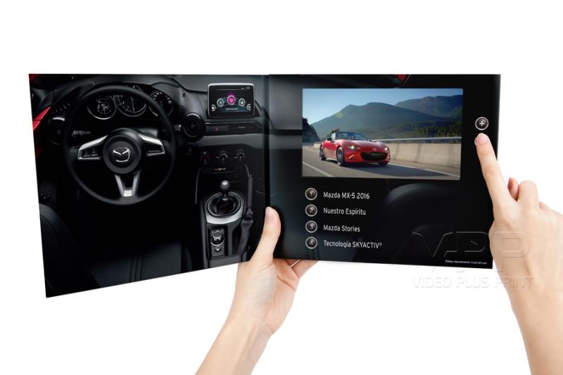 The VIDEO BROCHURE is printed packaging with a mirco-thin LCD screen, PCB boards, spearkers and rechargeable lithium batterues along with a USB connection that allows for change of video and recharging of the device.
