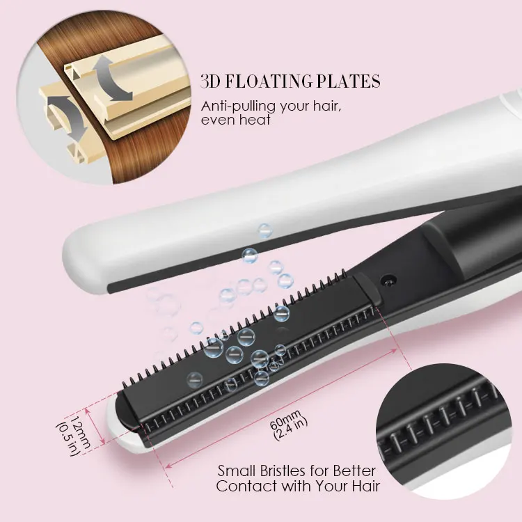 The portable flat iron features 1/2 inch tourmaline ceramic floating plates that provide even pressure and heat distribution, help to cut down on frizz and static, making your hair look perfectly smooth, salon quality results.