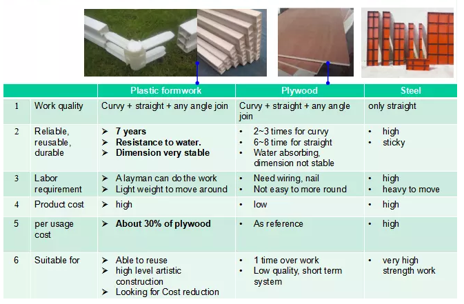Character #5:Much better comparing to plywood, metal formwork: on long-last, saving money, no cement sticky, water proof, light-weight, etc.